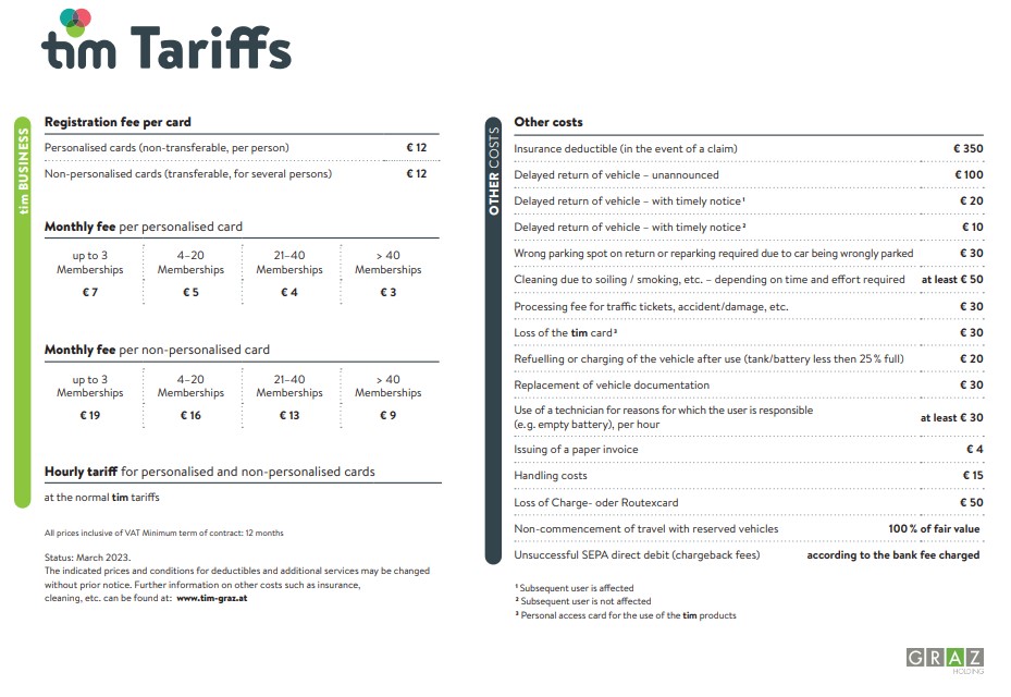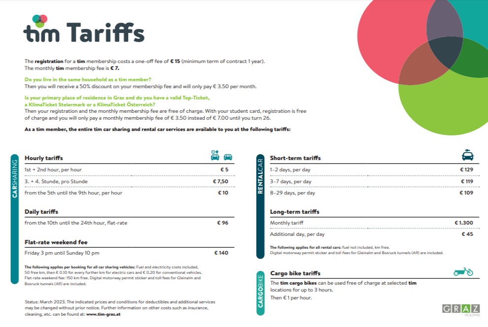 Affordable – there is a €15 registration fee and €7 a month fee for a membership card. If you have a Klimaticket the registration and monthly fee is waived. Rental rates start at €5 an hour for short term use (petrol is included and the first 50 km are free, 150 km on weekend, additional km cost €0.10 for e-cars and €0.20 for petrol cars)or €129 from 1 day for longer term use rental cars (can be driven abroad, unlimited km, petrol is not included). All cars have a vignette for the autobahn. More overview details here and a full handbook here (both are in English).