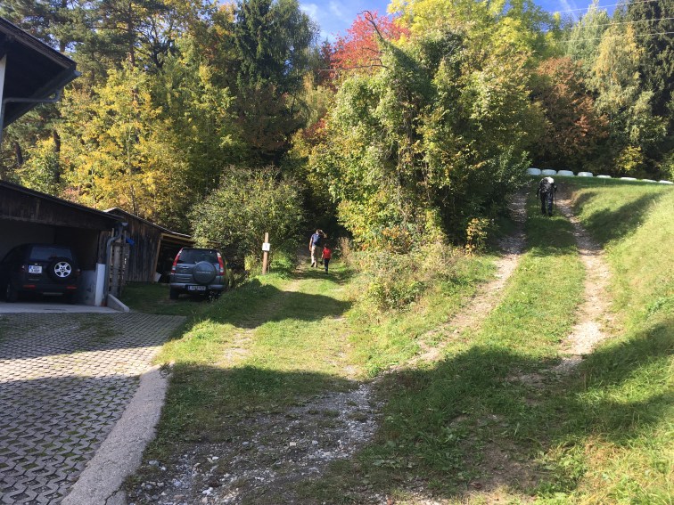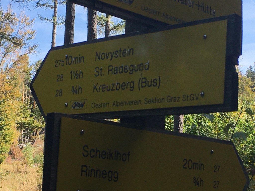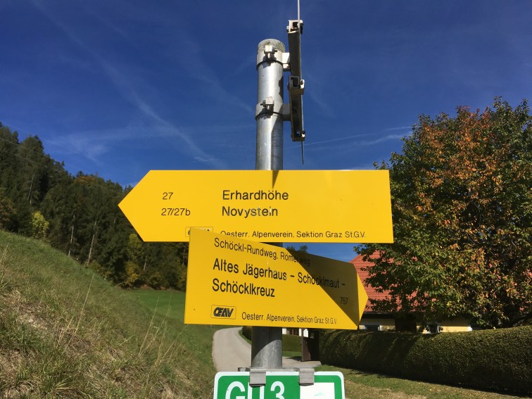 The hike starts at the Scheiklhof Buschenschank (Hohenbergstrasse 8 8061 St. Radegund). After parking, follow the road back to the intersection where you’ll see the yellow posts – you will be following 27 b Novystein route (left hand path in the photo).