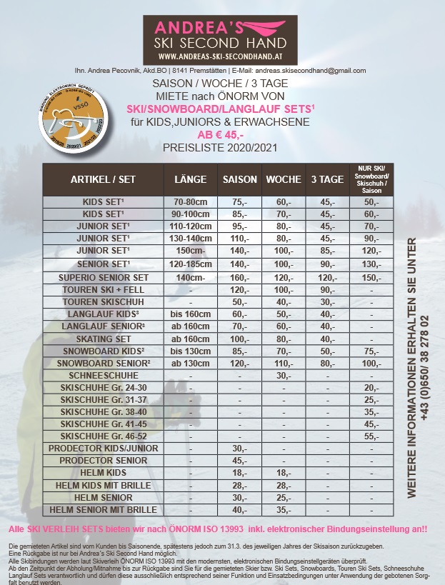 They operate from the basement of their home in Premstätten and have a huge selection of second hand ski equipment to rent or buy, plus good prices on new acessories (helmets, gloves, socks etc) as they buy them wholesale . They are open by appointment only between 8 am – 8 pm and they just see one family at a time (for about 30 mins). The friendly personal service includes measuring and fitting boots and advising on ski lengths. They are especially good with kids! My husband and I both brought skis for around €140 and boots for about €80 and we rented boots, skis & poles for the kids for the season for €90 each (see prices below). You also follow them on facebook and they open every year for the winter season around the end of Sept. It’s worth booking an appointment early on as they are very popular. They take cash only and I don’t think they speak English but they were very patient with my German!