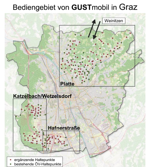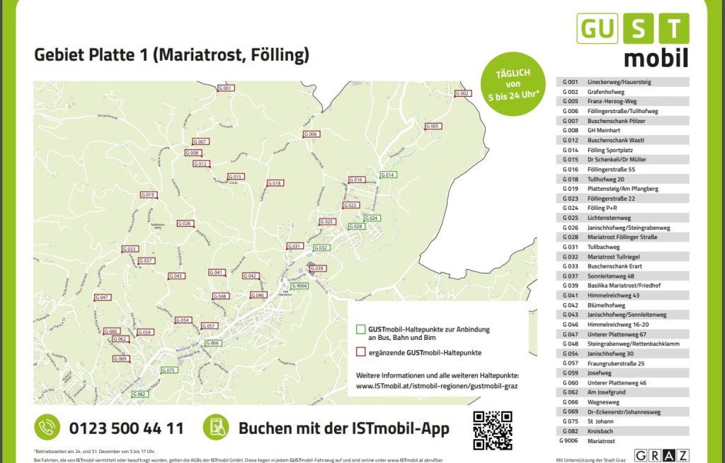 GUST mobil is a useful subsidised taxis service for the Platte, Hafnerstraße & Katzelbach /Wetzelsdorf suburbs of Graz. These areas are hard to reach by public transport and too hilly in parts to use a bike so residents and visitors have to reply on private cars. Also there are some lovely walks in these areas so this a super way to get there if you don’t have a car!