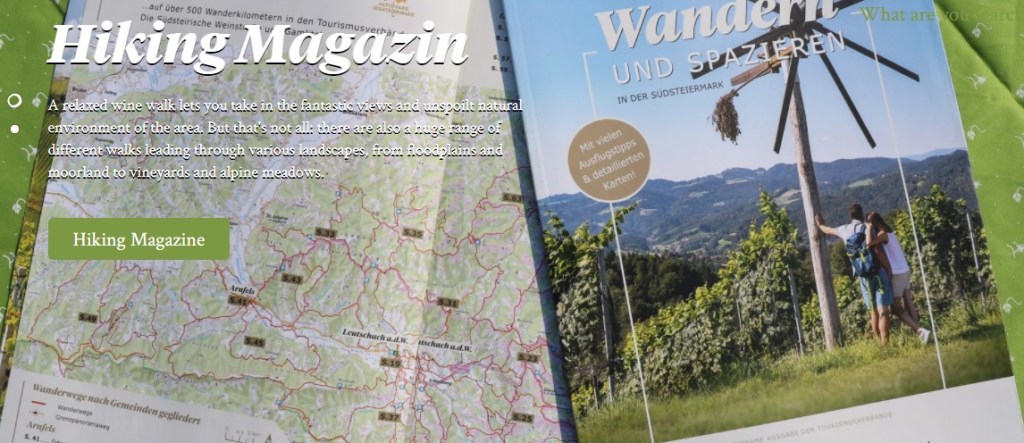 Autumn and spring are great times of the year to go hiking in the wine country, just south of Graz. You can read more about the area and it’s famous ‘Southern Styria Wine Road here. It’s a beautiful area to drive around and visit all the vineyard tasting rooms and buschenschanks. You can see a list of all the hikes here.