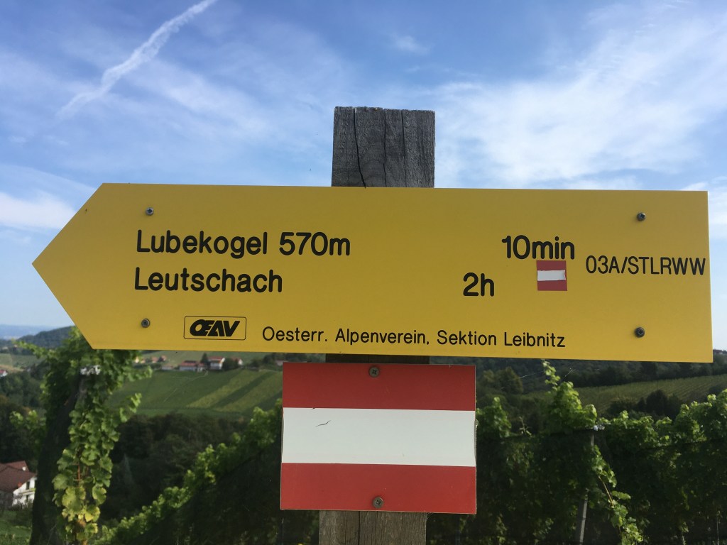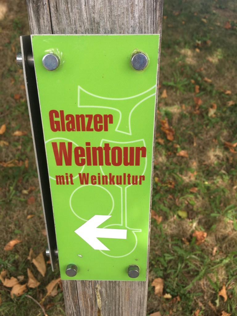 For the longer hike, we started at the car park near to the Tischermonegg buschenschank the “P” at top of the map, if it’s full then you can always find a parking spot at the “P” by Legat – 191 and start from there), From Tischermonegg we hiked up the grassy hill (marked with the yellow sign below) next to the restaurant to the view point overlooking the area. After admiring the view, join the path again and walk through the vineyards, following the Green ‘Glanzer Weintour’ signs or the green markings – the trail is well marked the whole way. (We did the circular route anti-clock wise, saving the buschenshanks with the nice views for towards the end).