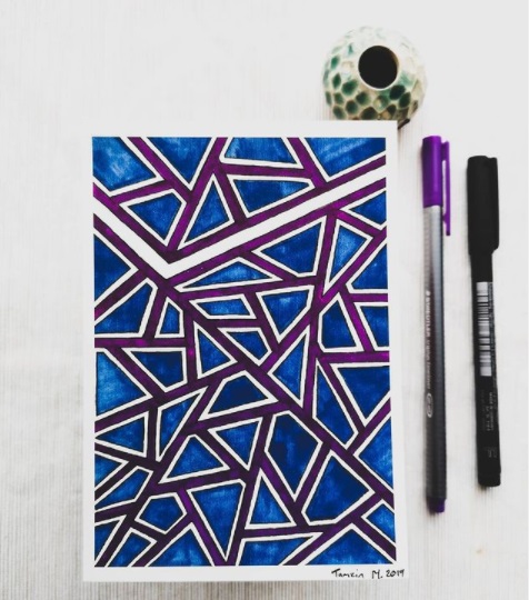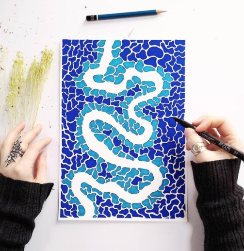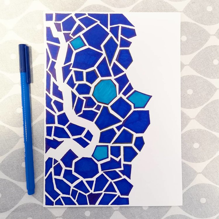 Originally from Ireland, Tamzin recently moved from Florence to settle in Graz. Her love of doodling led to the creation of her stunning patterns. There is a gentle balance in her work and the simple flow of her geometric shapes and curved lines are pleasantly soothing to look at. The varying shades of blue are also calming to the soul and she enjoys playing around with the positive mood effect of colour . Originally intended for her fabric collection, she realised people also enjoyed having her designs as wall prints.