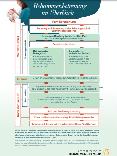 Try to find a midwife as soon as you can as they often book up! If you plan to give birth in a public hospital, the birth is covered by the midwife on duty but if you want to take your own midwife for a birth in a private hospital this will be need to be paid privately. You can search for one here to find one that takes your insurance (there are also lots of recommendations in the ‘Women in Graz’ facebook group mentioned below). You can also try contacting privates one as they sometimes offer the free services that are covered by your health insurance – one hour consultation between the 18 and 22nd week of pregnancy and several home visits in first 8 weeks after birth. Otherwise some other services can be refunded up to 80% by your health insurance. You can see details on what is covered and not covered here, including the useful graphic below (the green boxes are covered).