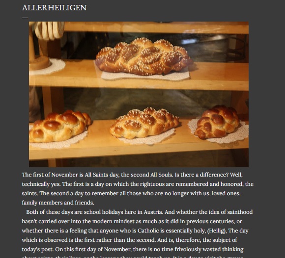 “Austrians celebrate All Saints Day, the Catholic holiday in remembrance of the Saint Martyrs, on November 1. All Saints Day in Austria is part of a week known as “Seelenwoche” (All Souls Week) during which the Austrians believe the curtain between the world of the spirits and the living is thinner than normal.