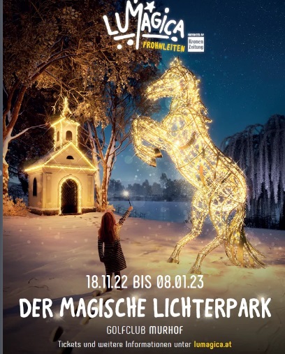 Outside of Graz, at the Murhof Golfclub near Frohnleiten, you can also enjoy Lumagica – a 1.5 km long circular path leads past an enchanted fairtale world, full of luminous objects and installations with music in the background. Tickets from €8 – €17. A shuttle service for visitors is available on Saturdays, Sundays and public holidays from Frohnleiten.