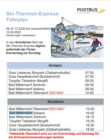 Many ski resorts are really only reachable by car but there are some ski buses from Graz, for example the Postbus goes Thursdays – Sundays from Murpark and the main Graz train station to Tauplitz and Bad Mitterndorf until March 10th (daily during the Feb semester school holidays). Adults €34 / kids €17.