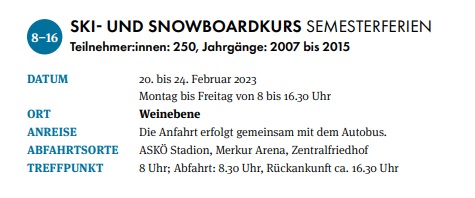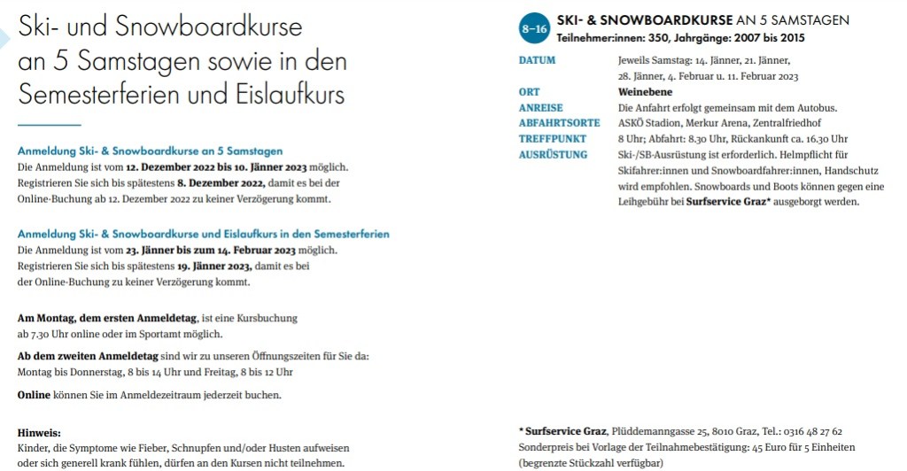 The City of Graz offer really good value ski courses for kids for Graz residents 5 x Saturdays or for a week in the semester holidays for only €10! Including bus transportation from Graz. These book up quickly! More details in their brochure here.