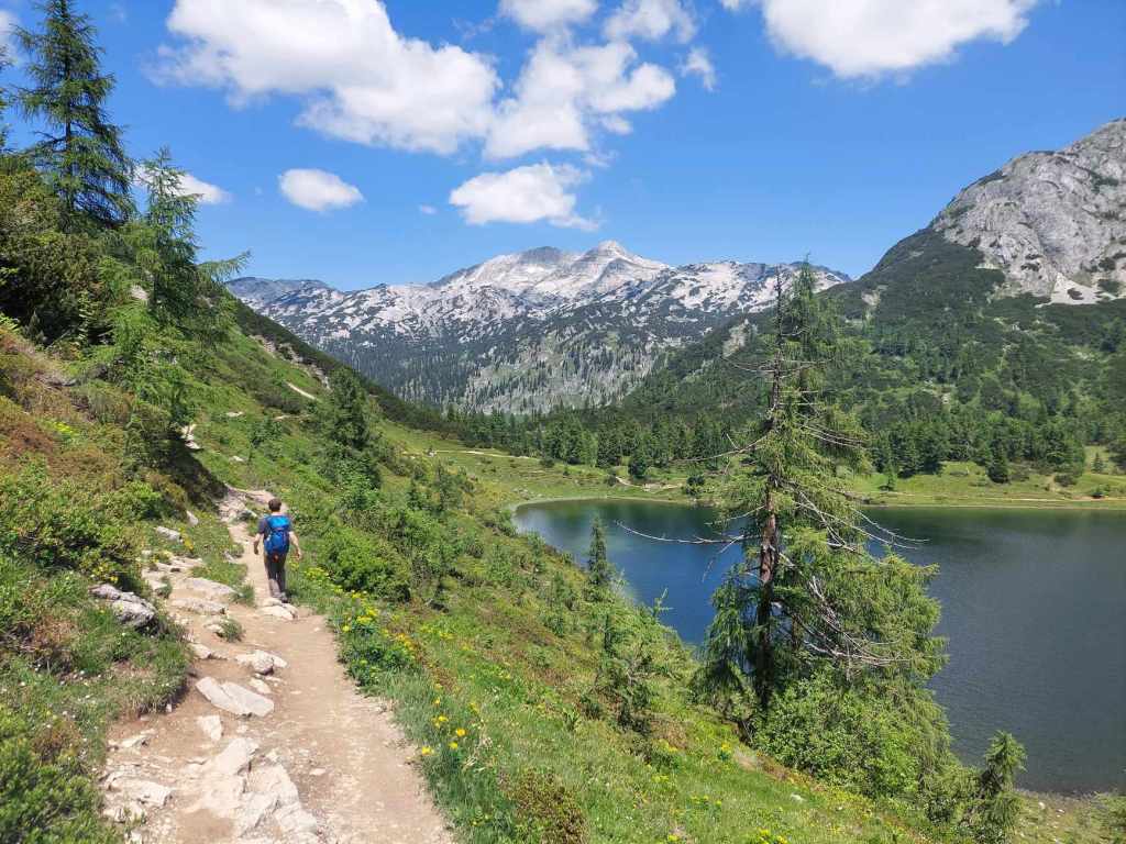 There are numerous hiking options around Tauplitzalm. The most popular is the 6-lake hike. There is a stroller, wheelchair friendly path that runs a lot of the way on bottom side (yellow path) and quite a few restaurants and huts to stop for a drink or meal. My favourite is to walk on the top blue hiking path as it’s more of a hiking trail and interesting terrain, still very accessible but too rough for pushchairs. The Marchensee is tiny but a lovely place for a quick dip in the water and just beyond are streams which are popular for kids to play in.