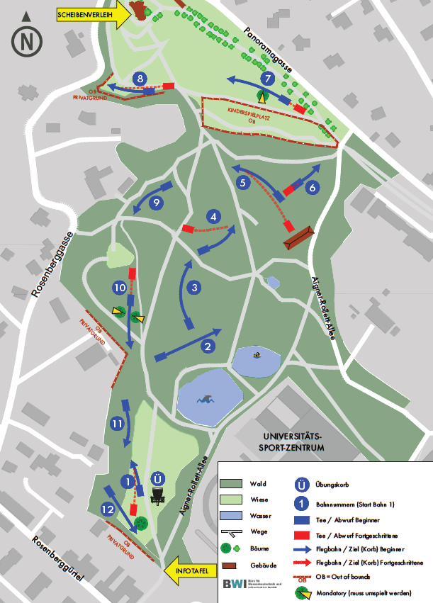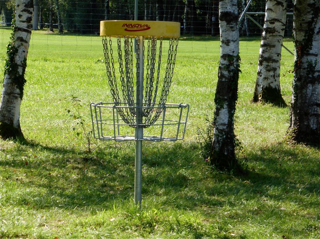 One throw (stroke) is counted each time the disc is thrown and when a penalty is incurred. The goal is to play each hole in the fewest strokes possible. The player with the lowest total strokes for the entire course wins. There are are 12 stations around Rosenhain, each with a ‘launch’ point from which you count how many throws until you land your disc in the net. It’s totally free to use.
