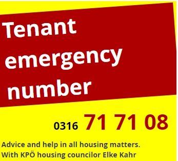 The KPÖ also offers a free Renter’s Hotline ‘Mieternotruf – (0316) 71 71 08. They can check rental agreements and utility bills, advise on harassment by landlords, terminations and eviction proceedings, problems with the deposit repayment, and also with other housing questions. They can also be contacted by email and a free consultation can be arranged. Useful information about deposits, rental termination etc on their webpage too.