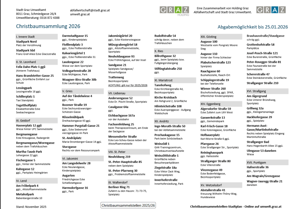 After christmas, the city of Graz has 70 sites around Graz where you can dispose of your christmas tree for free until January 25th (remove all the decorations first).